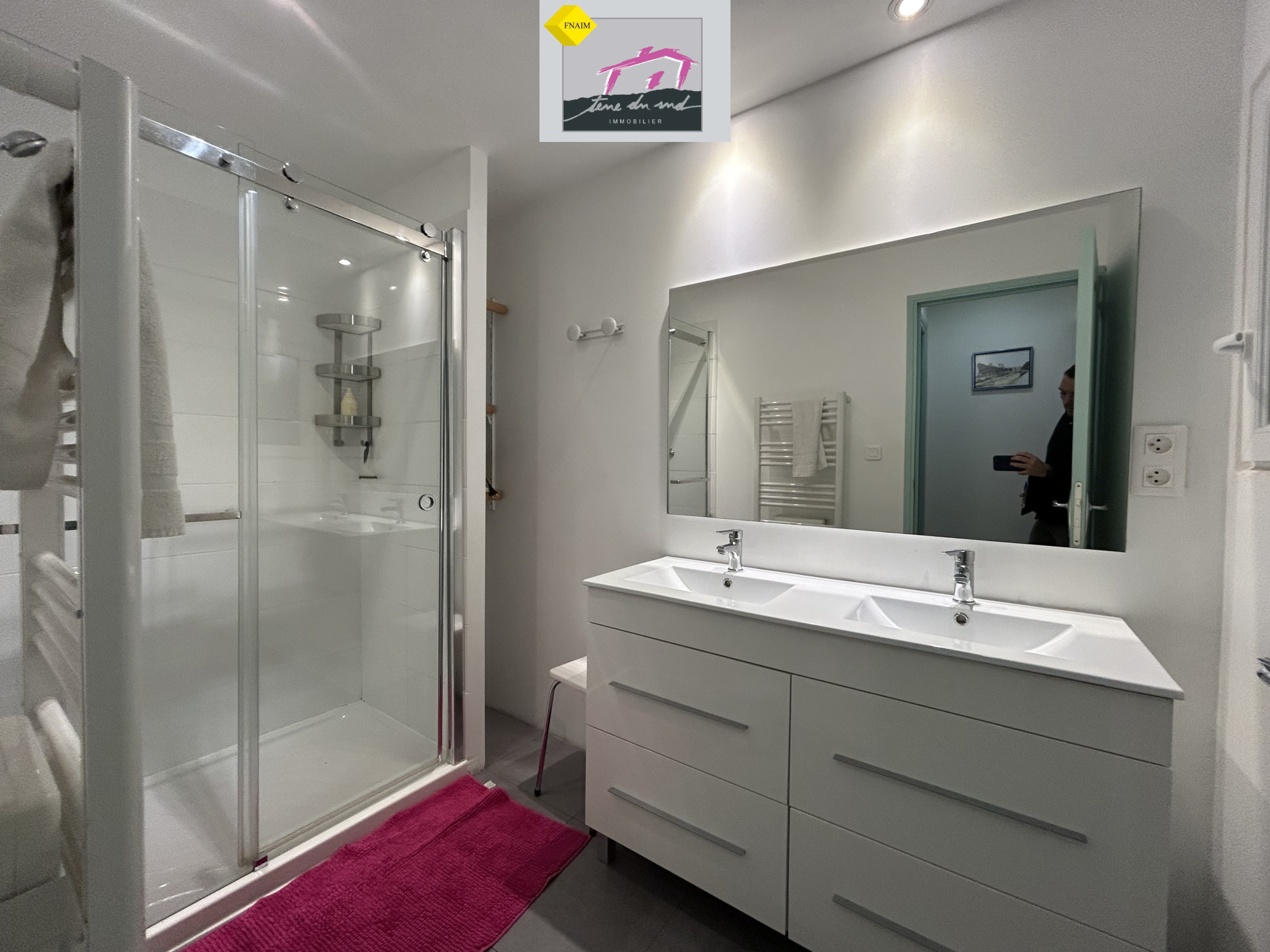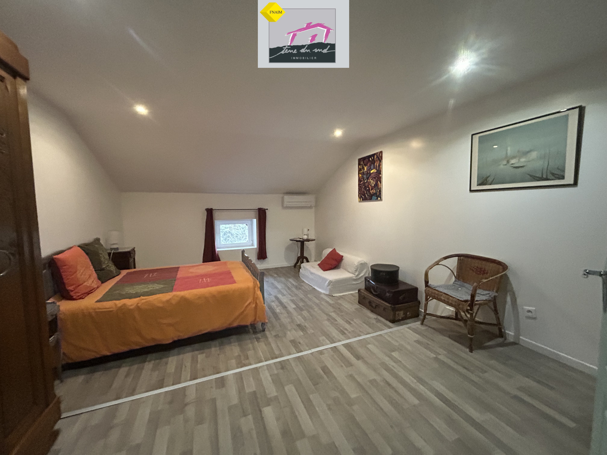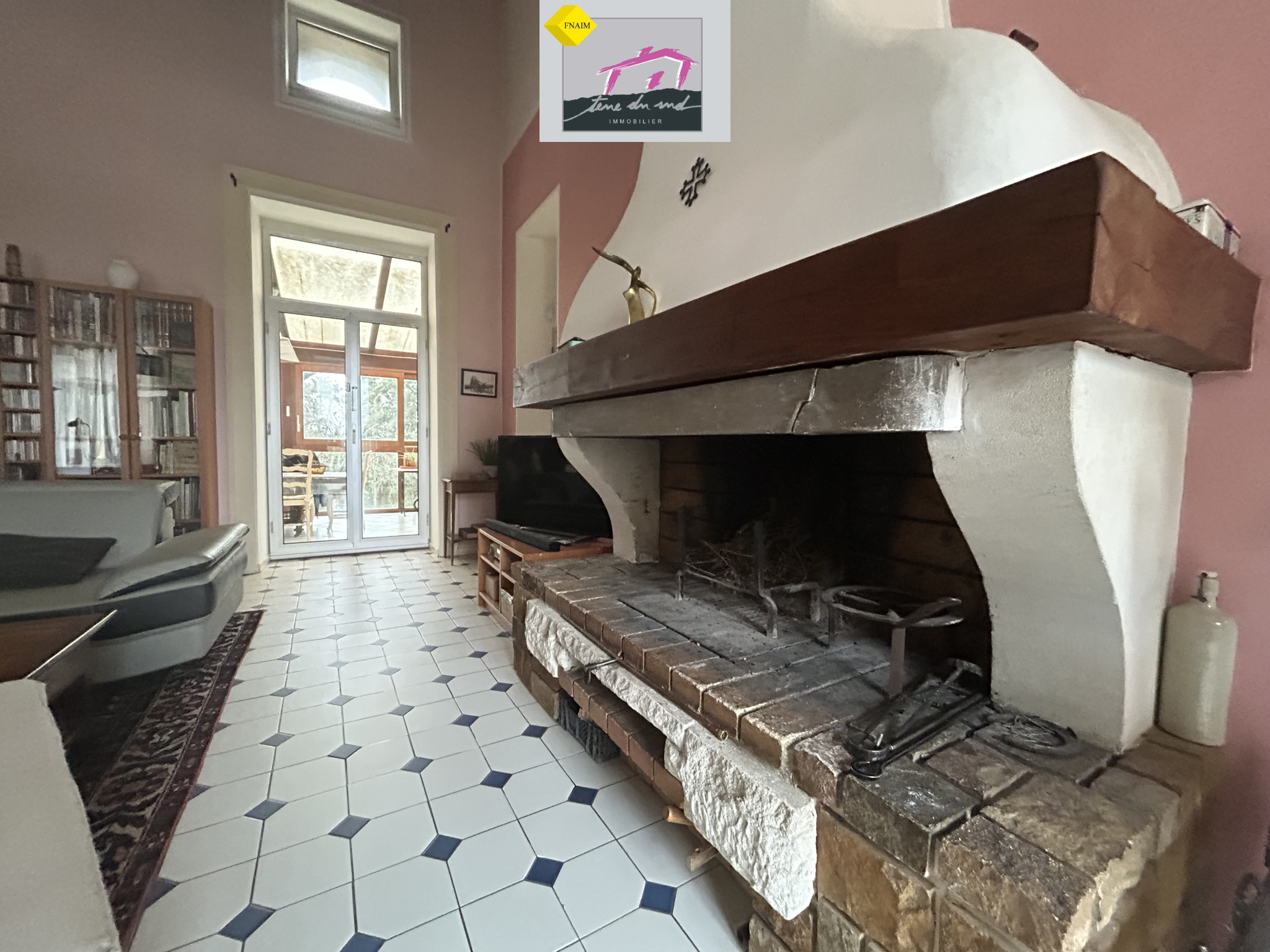La maison dévoile de beaux volumes, avec un salon–séjour cathédrale baigné de lumière, sublimé par une cheminée, créant une atmosphère chaleureuse et raffinée.