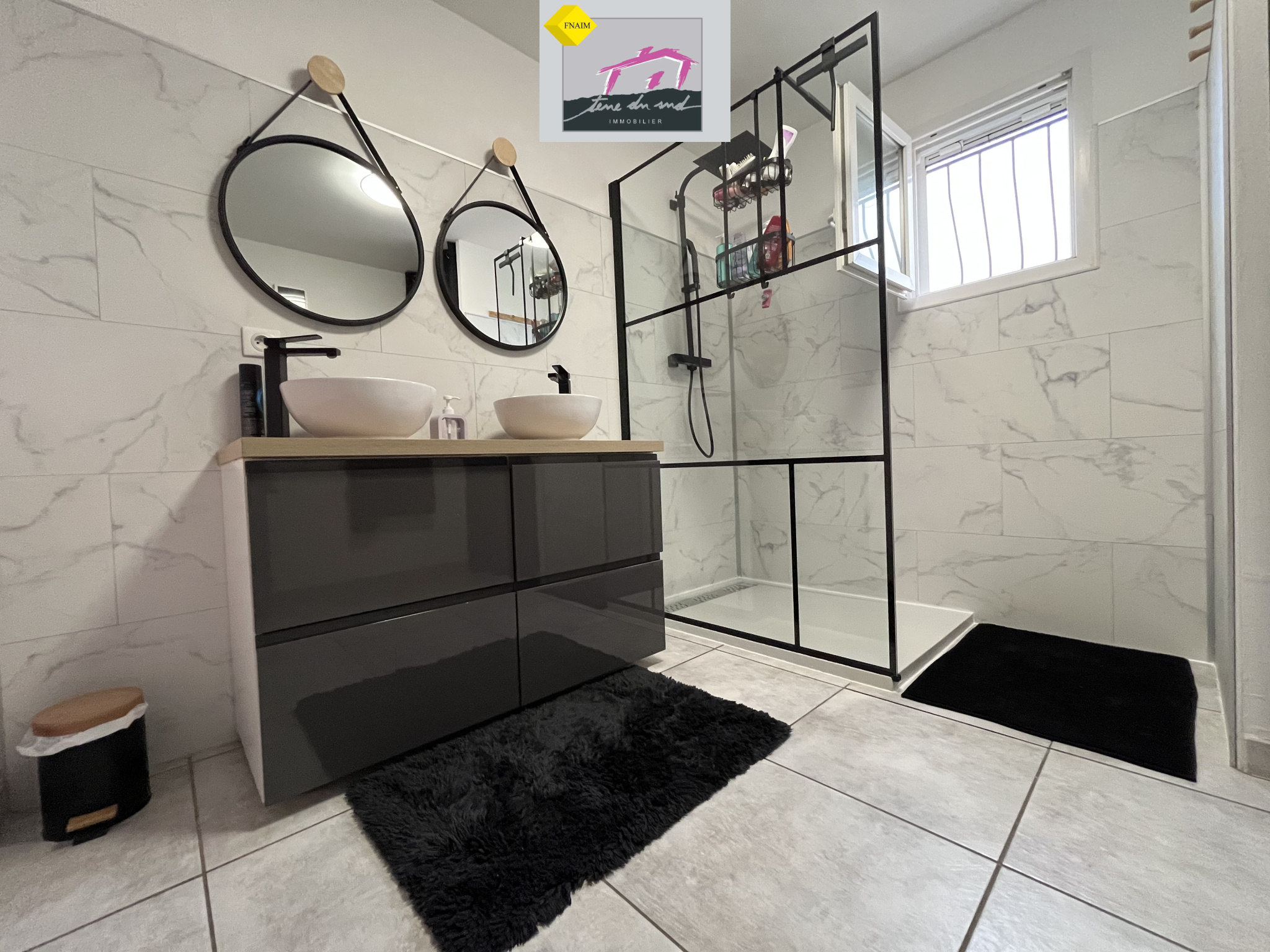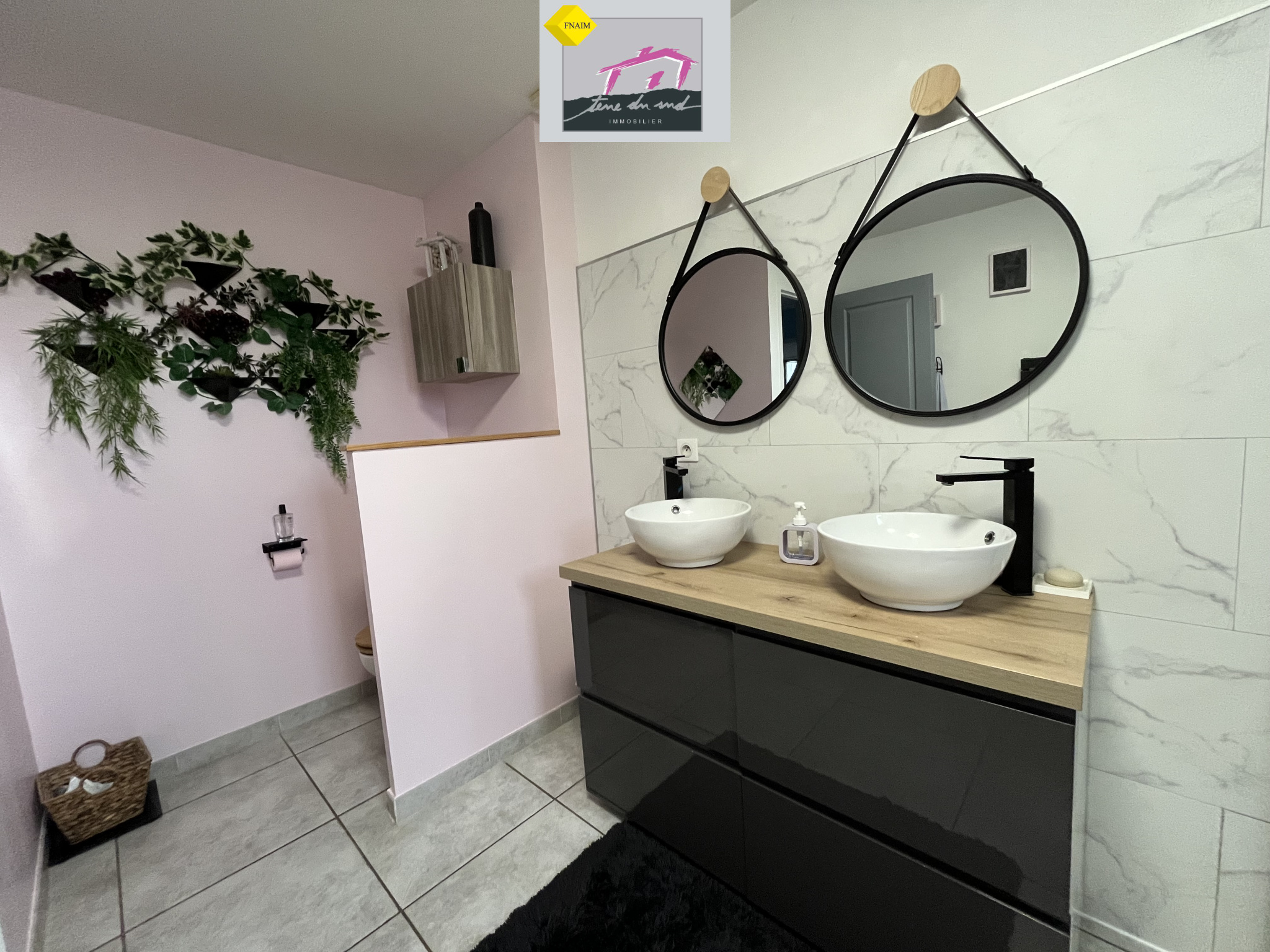 Une grande salle d’eau avec douche à l’italienne et double vasque avec un second WC.