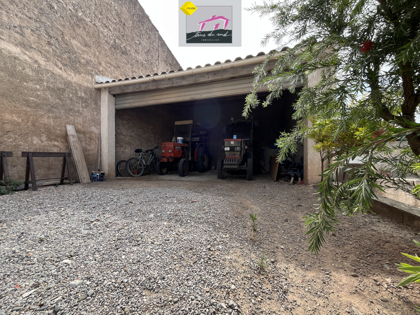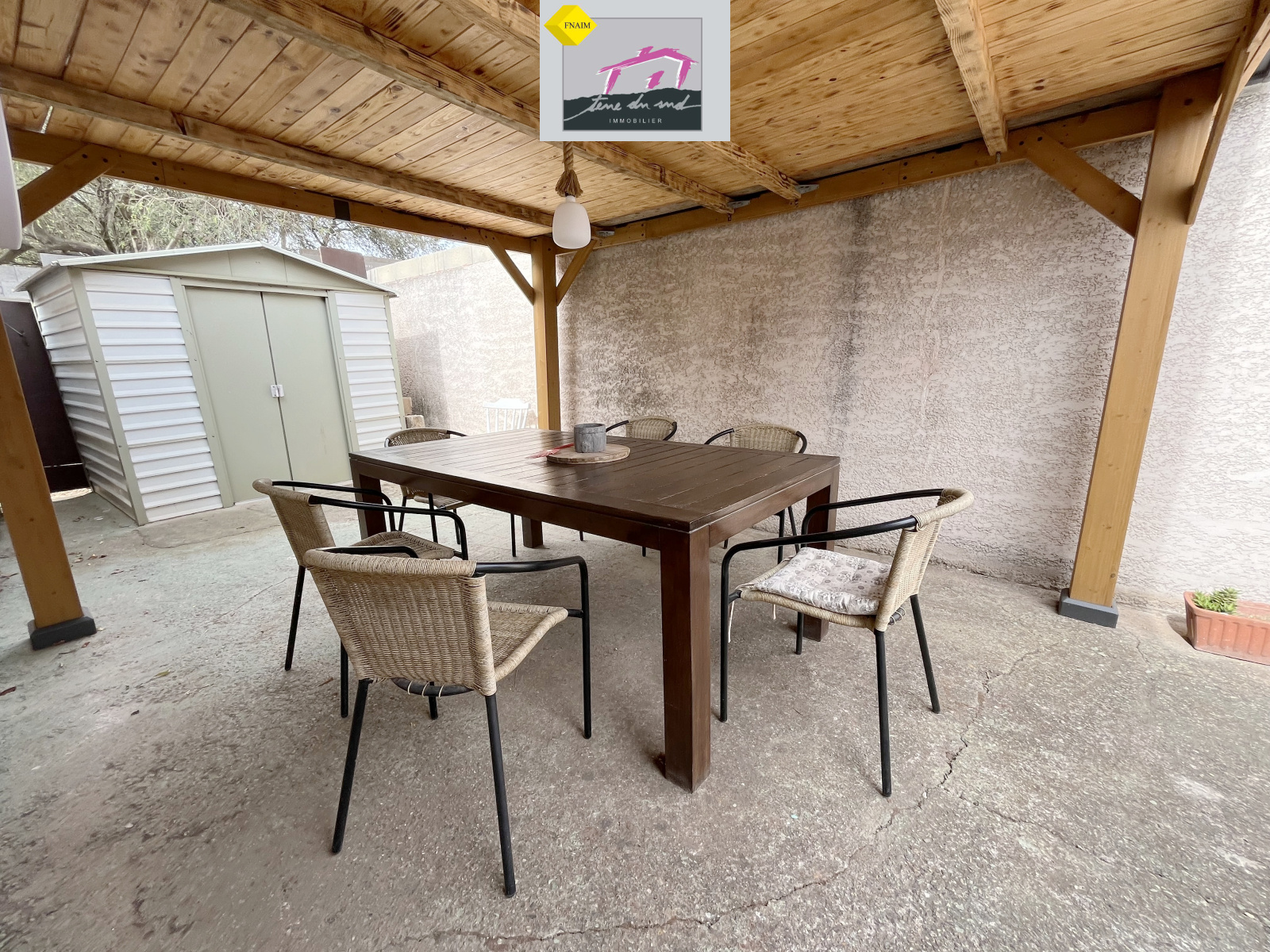 Terrain clos de 816 m² avec un grand hangar fermé pour le rangement, les loisirs. Un carport pouvant abriter plus de 4 véhicules